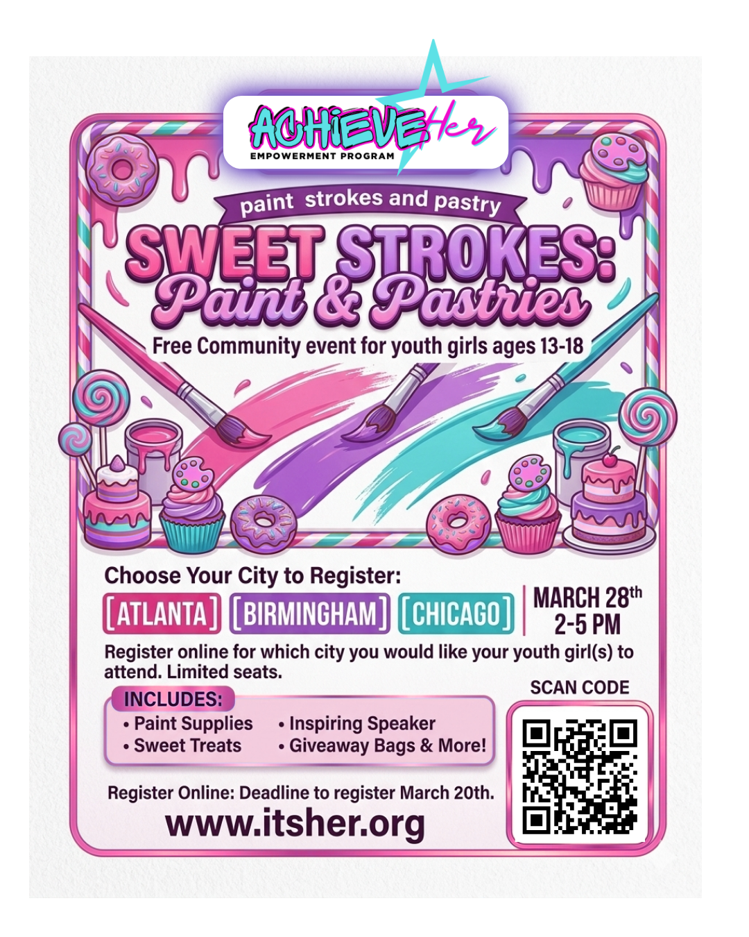 Join It’s Her for a fun and empowering afternoon designed especially for girls ages 13–18. Sweet Strokes: Paint & Pastries brings creativity, confidence, and connection together through guided painting, sweet treats, inspiring conversation, and special giveaways.
